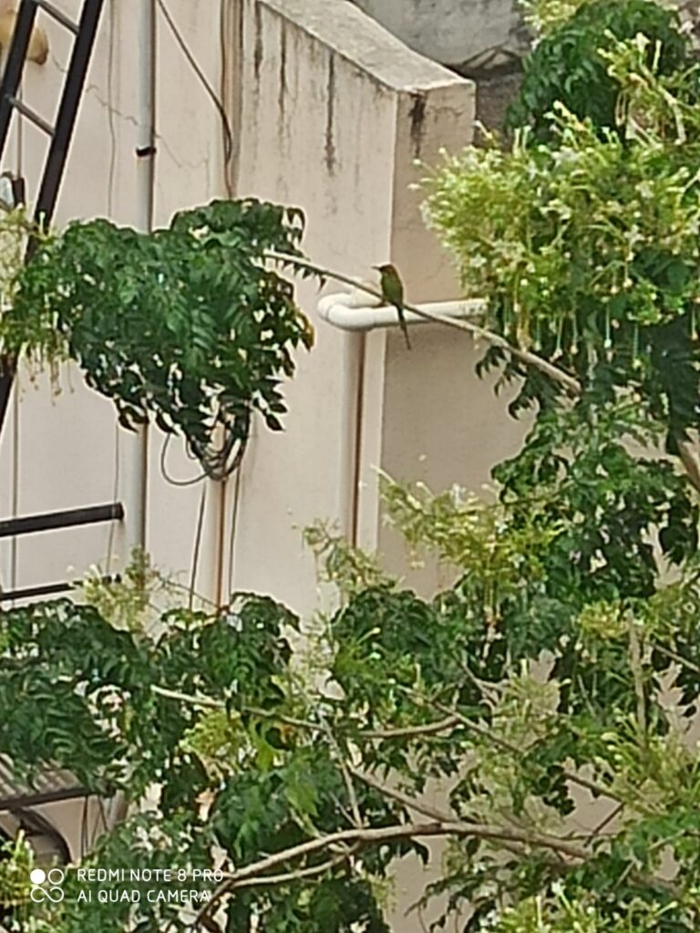 तेंत हिरवे रंगाचे पोपटा सारखो दिसणारो पण आकारान ल्हान सणारां सुकणां माला गिरक्यो घेत सताना दिसलां. में म्हटलां हें केंचा सुकणां? इतके दिवसात कय बघीतलां नतलां. तेचीय बी माहिती शोधली अणि गिरक्यो घेत सणारे सुकणेचां नाव “वेडा राघू”(Green Bee-eater). हे फुलावर बेसलेल्यो माश्यो, किडे हेना वारेत गिरक्यो घेव्नी चोचीत धरनी एखाद्या खांद्यावर बेसोनी आस्वाद घेसत. संध्याकाळा एकत्र येवनी टीर-टीर -टीर असो किणकिणो आवाज करनी गोंधळ घालसत.