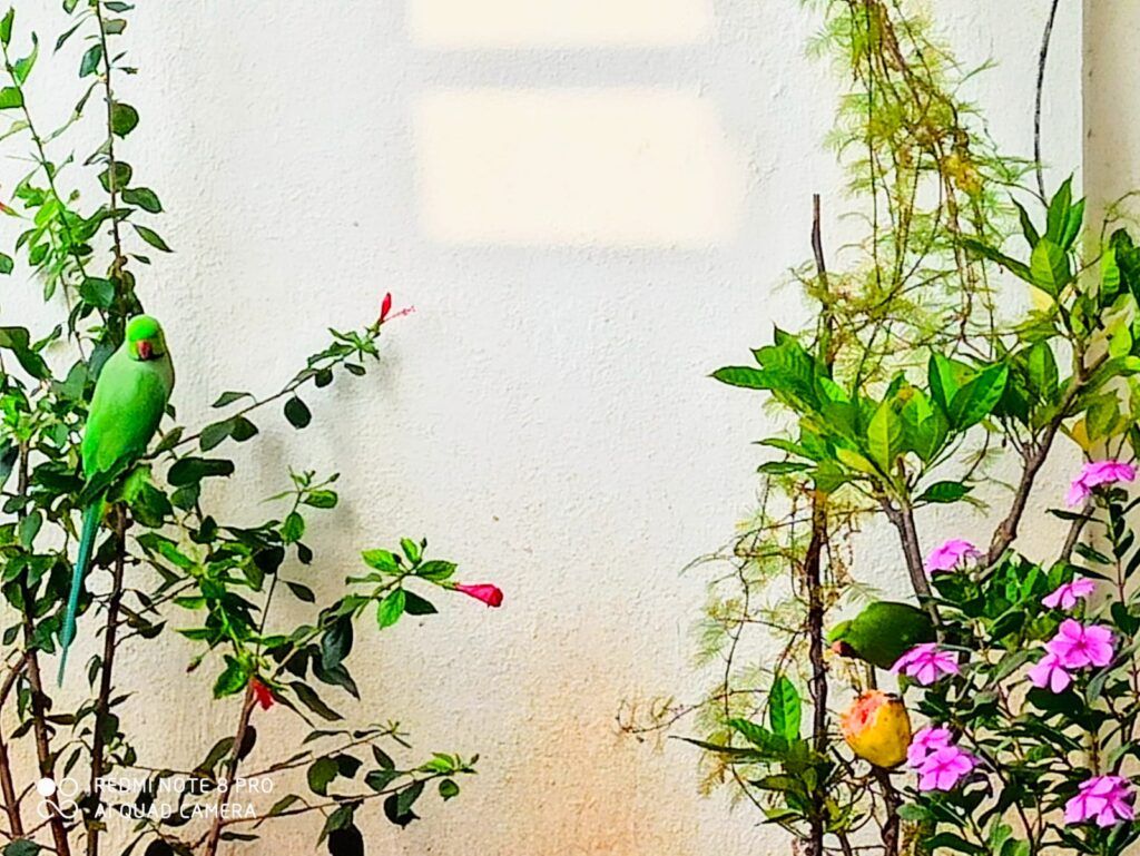 आमचेत्या सद्दानी निरनिराळी सुकणी हजेरी लायसत. पोपट, मैना, चिमण्यो हेंचो वेळ बी ठरलेलो ससे. न्याहारीचो वेळ कय चुकवेचो म्हणी नाय. तांदूळ, पेरां, सफरचंद असां तेचां आवडीचां खाद्य. निरनिराळे आवाज काढनी ‘में आयलो सां ‘ असा आम्ला सांगसत. एतां में खायवे थेयनार हेचो अंदाज आयलो जाले आपलो गोतावळो बी बरोबर घेवनी हजर सनार हे मात्र ठरलेलाच ससे.